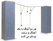 ١- ٥ تکه موم را به انتهای پنج تکه نخ (که از قبل بریده اید) وصل کنید و بدین ترتیب پنج آونگ بسازید. یک نخ بین دو میز وصل کنید و پنج آونگ فوق را (در فواصل مساوی) روی آن نصب نمایید. به ترتیب هر کدام از آونگ های سبز رنگ را به نوسان در آورید. از آنجا که طول آنها متفاوت است بنابراین با بسامدهای متفاوت نوسان می کنند.